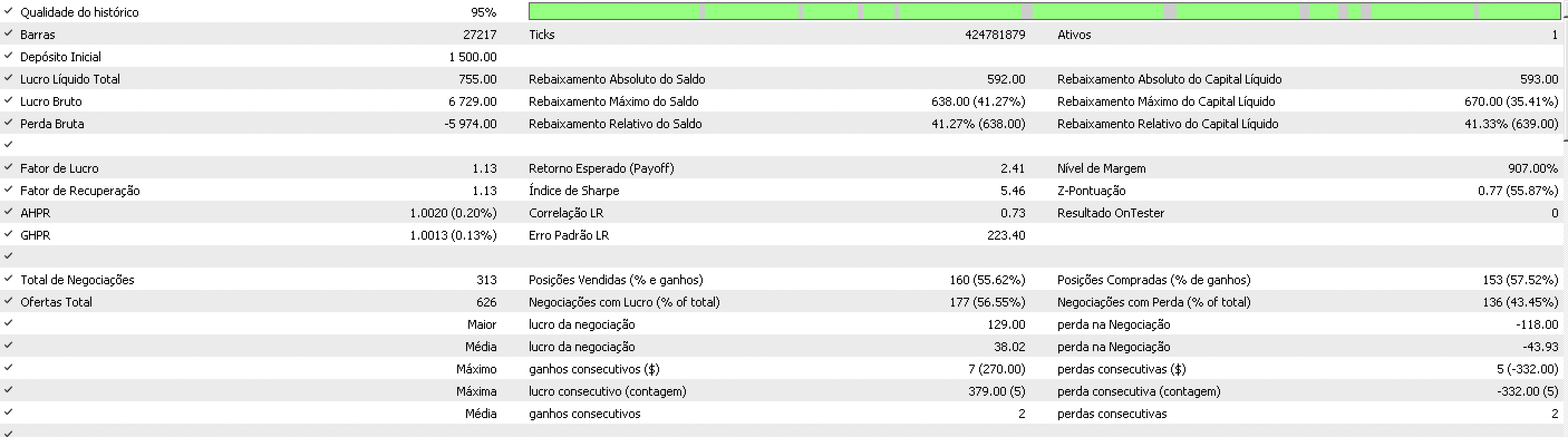 Como ponto de atenção, apresenta-se a informação de termos um ganho médio por operação positiva levemente menor à perda média por operação negativa. Temos este resultado pelo fato de termos a proteção de lucro (Breakeven), o que não comprometeu a performance do setup.