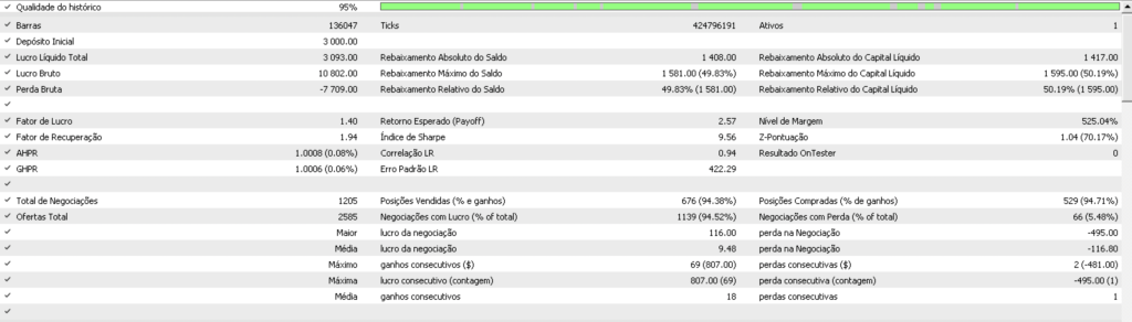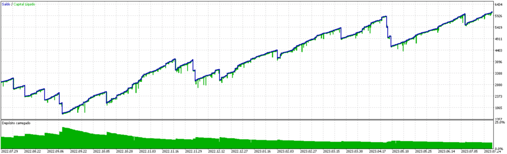 Ao longo de 30 dias em que testamos em conta real, o setup fechou todos os dias positivos e realizou cerca de 6,7 operações por dia (mantendo a média demonstrada no backtest). Tivemos dias onde o robô realizou 14 operações e outros dias o robô realizou apenas 2, mas é importante lembrar que durante os testes em conta real nós não limitamos o ganho/perda do robô e por conta disso ele trouxe lucros maiores do que a meta configurada no setup.